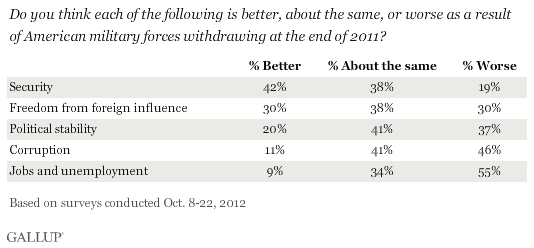 More Iraqis feel safer now that U.S. troops have been removed from the country, according to a new survey from Gallup. While Iraqis feel more secure with American troops gone, Gallup did find that on other crucial metrics, such as political stability and jobs and unemployment, Iraqis are far less confident.