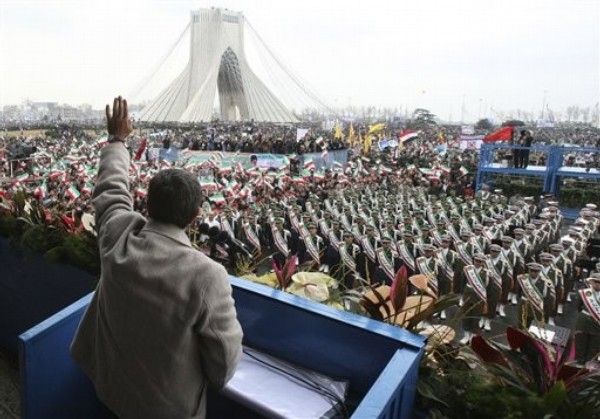 Iranian President Mahmoud Ahmadinejad, waves to the crowd in a rally marking the 32nd anniversary of the 1979 Islamic Revolution, at the Azadi (Freedom) Square, in Tehran, Iran, Friday, Feb. 11, 2011, while the Azadi monument tower is seen in background. President Ahmadinejad said Egypt's popular uprising shows a new Middle East is emerging, one that will have no signs of Israel and U.S. (AP Photo)
