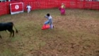 Determined bullfighter faces down bull after the animal rips his pants and the matador is forced to finish the performance wearing floral swimming trunks.