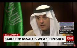 ADEL AL-JUBEIR: I believe Bashar al-Assad is weak and I believe Bashar al-Assad is finished and I believe Bashar al-Assad has no future in Syria. Bashar al-Assad butchered, massacred, and killed his people--men, women, and children--and his military couldn't save him. So he prevailed upon the Iranians to come and support him, who sent their Quds Force and their Revolutionary Guards. And they, in turn, couldn't save him. So Iran and Bashar al-Assad mobilized Hezbollah, Shia militias from Iraq, Pakistan and Afghanistan, and they, in turn, couldn't save him. And now we have Russia going into Syria, in support of Bashar al-Assad, and they will not be able to save him. A man who is responsible for the murder of 300,000-plus people, the displacement of twelve million people, and the destruction of a country is a man with absolutely no future in this country.